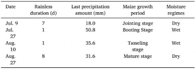 采樣在干濕交替條件下進行。2020年7月9日(拔節(jié)期)、7月27日(孕穗期)、8月10日(抽雄期)、8月27日(成熟期)分別采集土壤和玉米莖樣品。7月9日和8月27日為干旱期,持續(xù)7-8天;7月27日和8月10日為降雨后的濕潤期。上午8-9點,從15個地塊的玉米莖第一節(jié)間采集樣品,同時在莖采樣位置附近的不同深度(0-100 cm)采集土壤樣品。部分樣品用玻璃瓶密封后冷凍保存,測定氫和氧穩(wěn)定同位素;另一部分樣品帶回實驗室,在105℃烘干24小時至恒重,以確定土壤含水量。