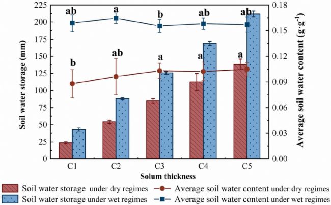 圖2 土壤厚度20 cm (C1)、40 cm (C2)、60 cm (C3)、80 cm (C4)、100 cm (C5)處理土壤儲量及平均含水量的變化特征。
