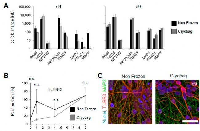 冷凍保存的細胞在神經(jīng)分化過程中表現(xiàn)出了與未冷凍細胞相似的基因和蛋白質(zhì)表達模式,盡管在第4天時神經(jīng)標(biāo)志物的表達有所延遲,但在第9天時已得到補償。
