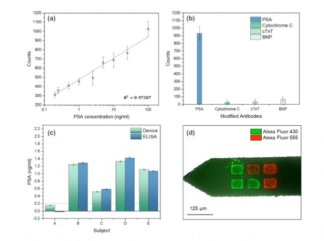 圖2. a) 血清中PSA濃度增加的線性響應(yīng)曲線。B)特異性測量,PSA 抗體修飾并引入不同的蛋白質(zhì):細(xì)胞色素 C、BNP、cTnT 和 PSA。結(jié)果表明,只有特異性的PSA蛋白生物標(biāo)志物表現(xiàn)出高熒光響應(yīng),而非特異性蛋白質(zhì)可忽略不計。(c) 使用 SiNPs 裝置對 5 名志愿者進(jìn)行 Invivo 測量,用于量化 PSA 濃度(青色條)與 ELISA 測量值(藍(lán)色條)相比。(d) 多路檢測的熒光圖像,檢測多個感應(yīng)區(qū)域上兩種不同的熒光基團(tuán)。