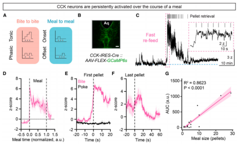 研究人員推測(cè)DRN腦區(qū)CCK陽(yáng)性神經(jīng)元抑制攝食行為可能采取bite-to-bite模式(進(jìn)食過程中每一口之間的神經(jīng)元變化)和meal-to-meal(在每一餐之前或之后神經(jīng)元變化),并利用在體光纖鈣成像系統(tǒng)進(jìn)行驗(yàn)證。他們檢測(cè)到小鼠在咬第一口食物時(shí)DRN腦區(qū)CCK陽(yáng)性神經(jīng)元鈣離子活性顯著升高,在整個(gè)攝食過程中維持較高的水平。在延遲性攝食實(shí)驗(yàn)中單次撕咬食物顆粒時(shí)顯著激活DRN腦區(qū)CCK陽(yáng)性神經(jīng)元,然而在20秒內(nèi)恢復(fù)到基礎(chǔ)水平。恐懼、危險(xiǎn)等非能量代謝相關(guān)的刺激也可以抑制攝食。然而擠壓尾巴或狐貍尿液均不影響DRN腦區(qū)CCK陽(yáng)性神經(jīng)元活性。