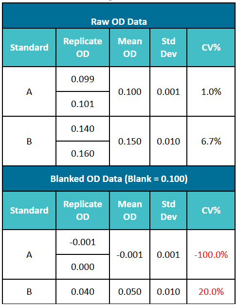 以下示例說(shuō)明了背景值扣除對(duì)變異系數(shù)的影響。在表1中,標(biāo)準(zhǔn)A的平均OD值為0.100,標(biāo)準(zhǔn)B的平均OD值為0.150 。當(dāng)通過(guò)原始讀數(shù)減去空白對(duì)照的OD值來(lái)計(jì)算變異系數(shù)(CV)時(shí),CV值顯著上升,導(dǎo)致標(biāo)準(zhǔn)B的CV%從6.7%增加至20%。