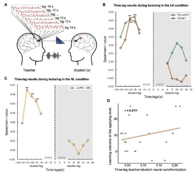 為了進一步考察教師在學生知識建構(gòu)過程中的作用,我們分析了師生間的神經(jīng)同步。結(jié)果發(fā)現(xiàn),在混合教學模式下,當教師的TPJ活動領先于學生MFC的活動8-10秒時,師生之間會出現(xiàn)顯著的時滯神經(jīng)同步,并且這種時滯神經(jīng)同步水平與學生的學習成績顯著正相關,表明在學生的MFC成功完成知識建構(gòu)之前,教師的TPJ已經(jīng)對知識結(jié)構(gòu)進行了定向投射,師生跨腦區(qū)的時滯神經(jīng)同步促進了學生的個性化知識建構(gòu)。可見,即便知識建構(gòu)發(fā)生在學生的大腦皮層,但是仍然離不開教師的有效教學。教師的引導作用仍然不可或缺。