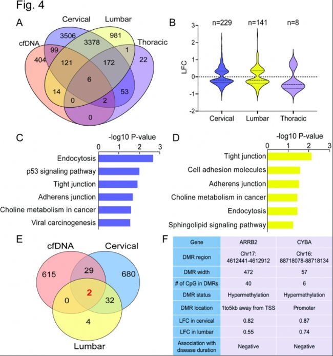 A. 維恩圖展示cfDNA中DMR相關(guān)基因與ALS患者三個脊髓節(jié)段中鑒定的差異表達基因(DEGs)之間的重疊。