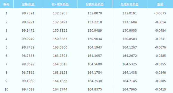 ①取10塊全新96孔深孔板在天平上稱取空板重量(單位:g)