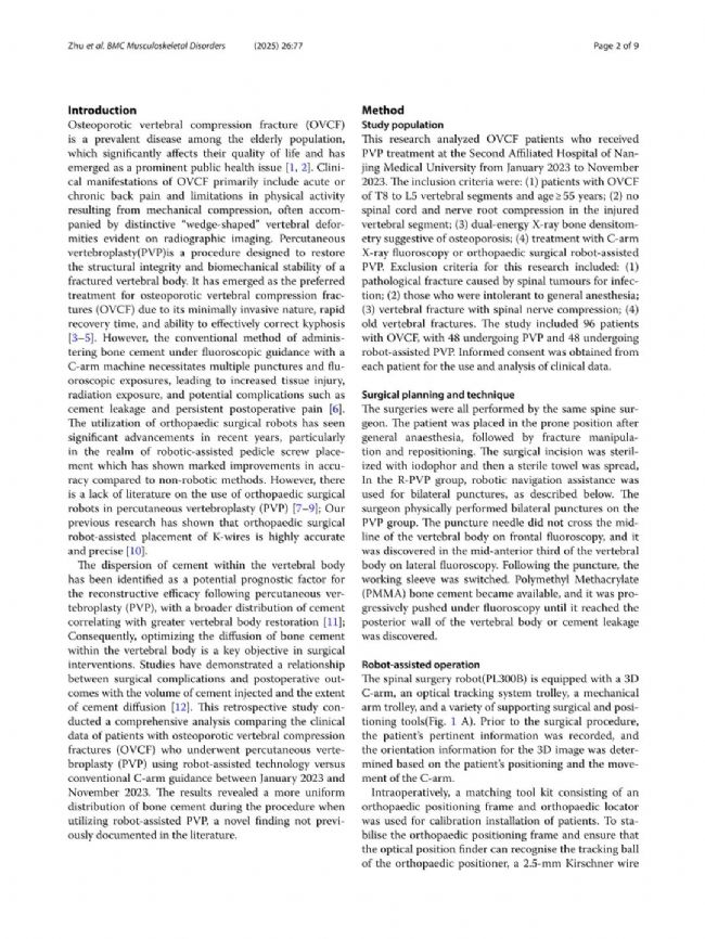 01 背景介紹 論文標(biāo)題:機(jī)器人輔助經(jīng)皮椎體成形術(shù)后水泥彌散程度研究