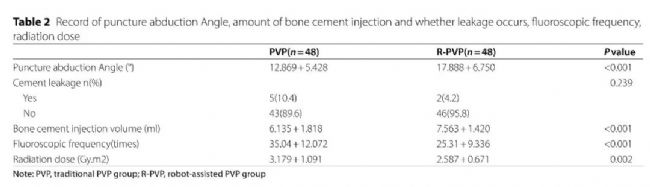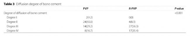 ② 注入骨水泥的量在PVP組中為(6.135+1.818)毫升,在R-PVP組中為(7.563+1.420)毫升,兩組之間存在顯著性差異。
