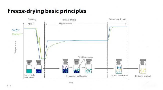 次級干燥:進一步升高擱板溫度至約 25℃,解吸冷凍濃縮物中殘留的水分,從而得到最終產(chǎn)品。