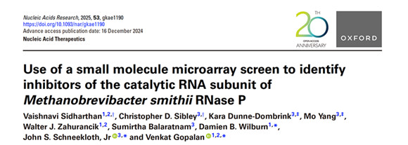 Sidharthan, V., et al., Use of a small molecule microarray screen to identify inhibitors of the catalytic RNA subunit of Methanobrevibacter smithii RNase P. Nucleic Acids Res, 2025. 53(1).
