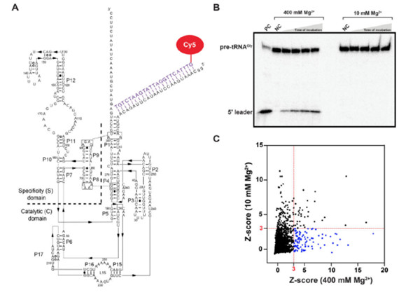 RNA標(biāo)記:Msm RPR通過5'端延伸的DNA寡核苷酸與Cy5熒光標(biāo)記的DNA寡核苷酸互補(bǔ)結(jié)合,形成熒光標(biāo)記的Msm RPR。