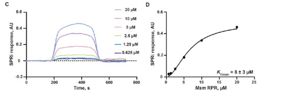 (C) 用于測定M1syn與Msm RPR結(jié)合親和力的代表性表面等離子體共振成像(SPRI)傳感圖。將濃度遞增的Msm RPR(0.625–20 μM)流過M1syn固定的芯片,獲得SPRI傳感圖和相應(yīng)的結(jié)合曲線(D)三次獨(dú)立試驗(yàn)的數(shù)據(jù)用于計算報告的結(jié)合親和力(K_D(app))值的平均值和標(biāo)準(zhǔn)偏差。
