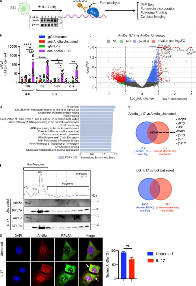 ARID5A與核糖體的相互作用:嘌呤霉素?fù)饺雽?shí)驗(yàn)表明ARID5A以某種方式促進(jìn)翻譯。通過(guò)蔗糖梯度離心(Polysome profiling)和免疫印跡分析,研究人員發(fā)現(xiàn)ARID5A主要與40S核糖體亞基結(jié)合,而在60S和80S核糖體中的結(jié)合較弱,表明ARID5A可能在翻譯起始階段發(fā)揮作用。熒光共聚焦成像顯示IL-17依賴的ARID5A與核糖體共定位。此外,IL-17促進(jìn)ARID5A從細(xì)胞核輸出到細(xì)胞質(zhì),并與40S核糖體亞基(18S rRNA)結(jié)合。ARID5A還與60S核糖體亞基(5S rRNA)有較弱的相互作用,表明ARID5A可能在翻譯起始過(guò)程中發(fā)揮動(dòng)態(tài)作用。