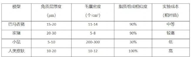 巴馬香豬皮膚因角質(zhì)層厚度(15-20μm)、毛囊密度(11-14個/cm²)及脂質(zhì)組成(神經(jīng)酰胺含量與人類接近)與人類皮膚高度相似,被推薦為IVPT的“金標(biāo)準(zhǔn)”模型。其藥物滲透率與人體數(shù)據(jù)的相關(guān)性(R²可達(dá)0.85-0.95)顯著優(yōu)于小鼠等其他動物模型。 其優(yōu)勢不僅體現(xiàn)在科學(xué)準(zhǔn)確性上,還兼顧了實驗可行性和倫理合規(guī)性,是藥物開發(fā)、化妝品評估等領(lǐng)域不可替代的工具。