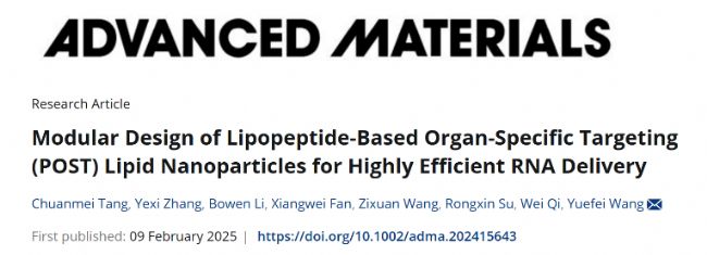 自新冠之后LNP 進(jìn)行RNA遞送,一直是一個(gè)非常熱門的研究方向。2025年2月初,天津大學(xué)王躍飛團(tuán)隊(duì)在 《Advance Materials》期刊上發(fā)表《Modular Design of Lipopeptide-Based Organ-Specific Targeting (POST) Lipid Nanoparticles for Highly Efficient RNA Delivery》。該文主要研究了基于脂肽(lipopeptide, LP)的模塊化設(shè)計(jì),開發(fā)了一種具有高效RNA遞送能力和器官特異性靶向能力的脂質(zhì)納米顆粒(lipid nanoparticles, LNPs),并命名為POST(Organ-Specific Targeting)LNPs。