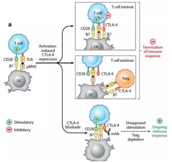 一是通過與CD28競爭性的結(jié)合B7或者招募磷酸酶到CTLA-4的胞內(nèi)結(jié)構(gòu)域部分從而降低TCR(T cell receptor)和CD28的信號。