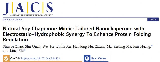 蛋白質(zhì)的正確折疊是維持其結(jié)構(gòu)與功能的核心過(guò)程,但折疊過(guò)程中易發(fā)生錯(cuò)誤,導(dǎo)致聚集或功能喪失。分子伴侶(如天然Spy蛋白)通過(guò)靜電吸引和疏水作用協(xié)同調(diào)控蛋白質(zhì)折疊,但其應(yīng)用受限于電荷單一性、結(jié)構(gòu)脆弱性及環(huán)境敏感性。針對(duì)這一挑戰(zhàn),近日中國(guó)醫(yī)學(xué)科學(xué)院黃帆/南開大學(xué)史林啟團(tuán)隊(duì)以“Natural Spy Chaperone Mimic: Tailored Nanochaperone with Electrostatic–Hydrophobic Synergy To Enhance Protein Folding Regulation”為題,在《Journal of the American Chemical Society》上發(fā)表相關(guān)研究成果,在這項(xiàng)研究中, 研究團(tuán)隊(duì)受天然Spy蛋白啟發(fā),設(shè)計(jì)了一種多功能仿生納米伴侶(nChap),通過(guò)靜電-疏水協(xié)同作用增強(qiáng)蛋白質(zhì)折疊調(diào)控能力,突破天然伴侶的局限。
