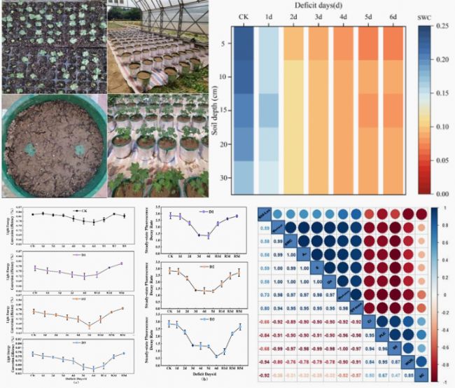 葉綠素?zé)晒獬上駜x對(duì)棉花品種‘新陸早 26 ’開(kāi)展研究。上左圖為棉花實(shí)驗(yàn)照片;上右圖為干旱過(guò)程中不同土壤深度的土壤含水量變化;下左圖為干旱和復(fù)水過(guò)程中光能轉(zhuǎn)換效率(a)和穩(wěn)態(tài)熒光衰減率(b)在消耗與恢復(fù)期間的變化情況;下右圖為各種生理特征之間的相關(guān)系數(shù)矩陣。結(jié)果表明,干旱會(huì)導(dǎo)致棉花葉綠素?zé)晒鈪?shù)下降,復(fù)水后其恢復(fù)程度與干旱時(shí)長(zhǎng)相關(guān)。