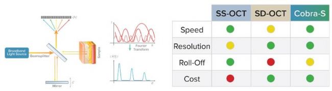 左圖:OCT概念示意圖,顯示了如何使用低相干干涉測量法來確定3維材料內(nèi)的結(jié)構(gòu)。右:使用Wasatch Photonics的Cobra-S OCT光譜儀對SS-OCT、傳統(tǒng)SD-OCT和高速OCT的關(guān)鍵性能參數(shù)進(jìn)行比較。