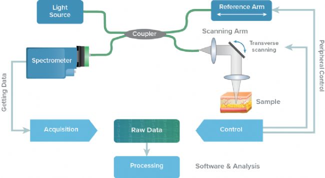 在SD-OCT系統(tǒng)中,寬帶激光分為兩條路徑:一條到參考臂,一條到待測樣品。從這兩條路徑返回的光被重新組合并干涉產(chǎn)生條紋圖案,光譜儀讀取該條紋圖案,光譜儀將每個波長的強(qiáng)度數(shù)字化。超連續(xù)激光器或低成本的超發(fā)光二極管(SLED)都可以用作光源。為了生成橫截面 OCT圖像,必須使用高速掃描機(jī)制(如振鏡或基于MEMS的設(shè)備)在樣品上快速掃描激光束。