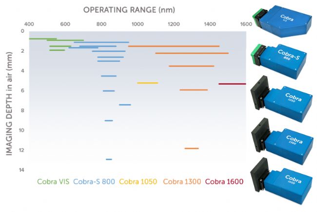 在掃描源OCT(SS-OCT)中,激光在波長上進(jìn)行掃描,單元件光電探測器捕獲信號。在光譜域OCT(SD-OCT)中,寬帶激光源與光譜儀等多元素檢測器結(jié)合使用。SS-OCT提供高速和低滾降(我們將在后面解釋該術(shù)語),但由于掃描源激光器的成本高,因此價格昂貴。SD-OCT以更低的成本產(chǎn)生更好的分辨率,但它無法在速度和滾降性能方面競爭,直到幾年前Wasatch Photonics推出了行業(yè)領(lǐng)先的SD-OCT,也是第一個將這些新相機(jī)集成到我們的Cobra-S OCT光譜儀產(chǎn)品線中。