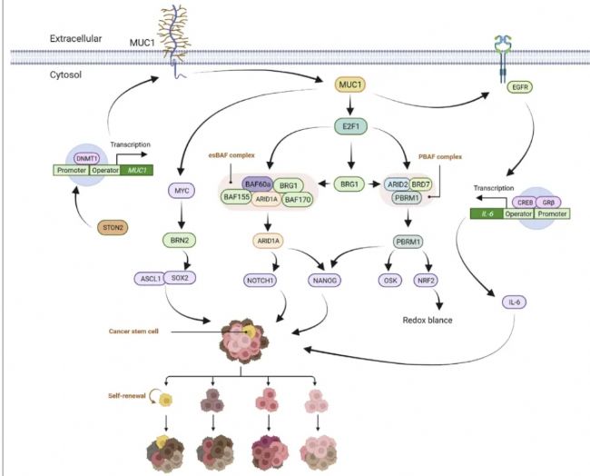 MUC1-C可直接與MYC結(jié)合,激活多能性因子和神經(jīng)內(nèi)分泌分化相關(guān)基因的表達(dá)。通過與E2F1的相互作用,MUC1-C能夠激活esBAF復(fù)合體,驅(qū)動(dòng)NOTCH1、NANOG等干細(xì)胞標(biāo)志物的表達(dá),維持腫瘤干細(xì)胞的自我更新能力。在神經(jīng)內(nèi)分泌前列腺癌中,MUC1-C整合MYC和E2F1信號通路,參與調(diào)控EMT進(jìn)程和干細(xì)胞特性的維持。此外,MUC1-C還通過PBRM1依賴的途徑調(diào)控氧化還原平衡,影響腫瘤干細(xì)胞的穩(wěn)態(tài)。