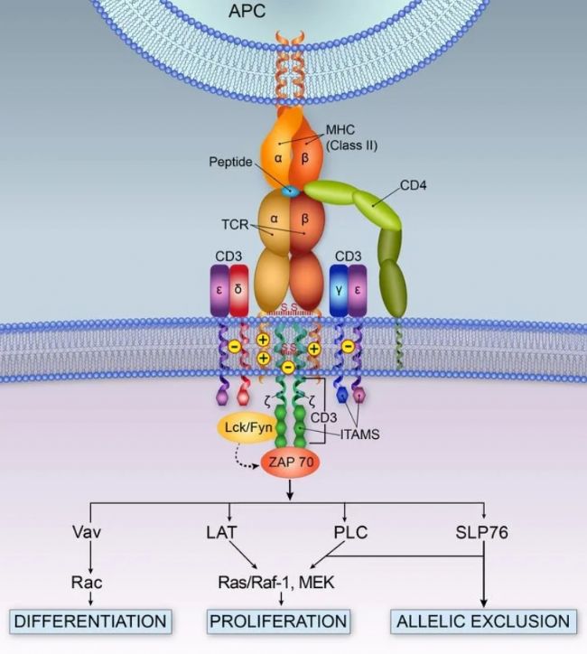 CD3ζ:這個亞單位是TCR復(fù)合物的核心信號傳導(dǎo)結(jié)構(gòu),它含有多個免疫受體酪氨酸基序(ITAM),負責(zé)啟動細胞內(nèi)的信號轉(zhuǎn)導(dǎo)。