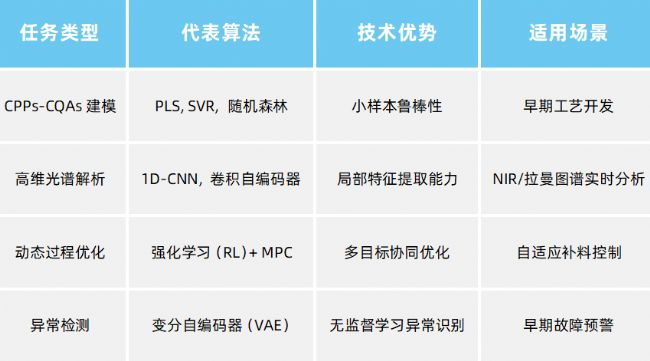 AI算法的核心優(yōu)勢(shì)在于其強(qiáng)大的模式識(shí)別、非線(xiàn)性建模、自適應(yīng)學(xué)習(xí)及預(yù)測(cè)能力,能有效處理PAT產(chǎn)生數(shù)據(jù),實(shí)現(xiàn)生物工藝持續(xù)控制與動(dòng)態(tài)優(yōu)化。