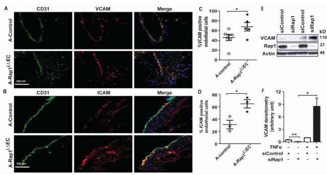 圖 2 在缺乏層流的情況下,內(nèi)皮細(xì)胞 Rap1 缺失會(huì)升高炎癥受體(CAM)的表達(dá)。