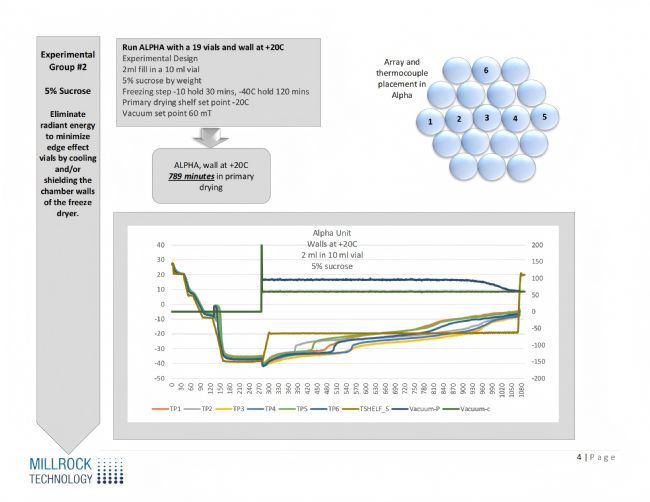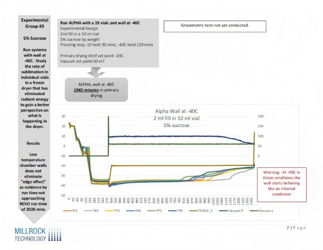 第二組實(shí)驗(yàn)旨在通過冷卻或屏蔽凍干機(jī)腔壁來減少邊緣效應(yīng)。設(shè)計(jì)了ALPHA裝置,將腔壁溫度分別控制在+20°C和-20°C條件下進(jìn)行實(shí)驗(yàn)。結(jié)果顯示,即使在-20°C條件下,主干燥時(shí)間仍為557分鐘,未能完全模擬全托盤的表現(xiàn),表明簡(jiǎn)單降低溫度不足以消除邊緣效應(yīng)。