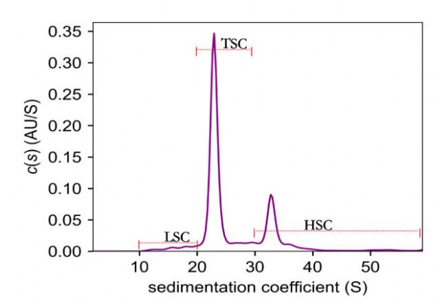 腺相關(guān)病毒(AAV)作為體內(nèi)基因治療首選載體,其制劑中Empty、Partial、Full及Aggregates等各類顆粒并存,雜質(zhì)與目標(biāo)顆粒粒徑差異微小,但直接影響藥效與潛在免疫原性。AUC憑借沉降系數(shù)的高分辨率,可高精度區(qū)分上述四種顆粒,并通過沉降系數(shù)值反推包裝完整性,實(shí)現(xiàn)對AAV異質(zhì)性的全景監(jiān)控。諾華全球首個(gè)獲批的AAV基因療法Zolgensma即采用AUC數(shù)據(jù)作為放行依據(jù)。
