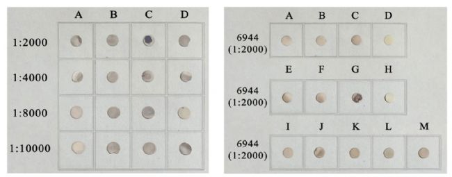 Dot-ELISA 檢測(cè)方法:識(shí)別宿主體內(nèi)的滋養(yǎng)體,采用放射免疫沉淀法提取 Hematodinium寄生蟲(chóng)蛋白,與高通量抗體芯片孵育篩選特異性單克隆抗體,芯片由英國(guó)ArrayJet公司的Marathon(現(xiàn)Mecury系列)生物芯片點(diǎn)樣儀制備,大約80, 000種單克隆抗體被點(diǎn)印在硝酸纖維素膜上,最終獲得了能特異性識(shí)別 Hematodinium 滋養(yǎng)體的單克隆抗體HD6944。實(shí)驗(yàn)通過(guò)觀察是否出現(xiàn)藍(lán)紫色斑點(diǎn)判斷是否感染,通過(guò)測(cè)試不同稀釋比例的單克隆抗體,確定 1:2000為最佳稀釋濃度;并對(duì)多種病原體進(jìn)行檢測(cè),驗(yàn)證了方法的特異性(圖3、4)。