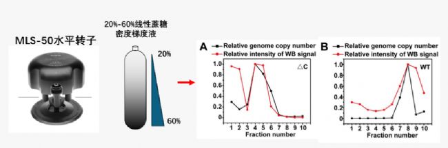 - 將懸浮液覆蓋在20至60%線性蔗糖梯度上,并在Optima MAX-XP超速離心機中使用MLS-50轉子在4°C下以34,000rpm超速離心3小時。