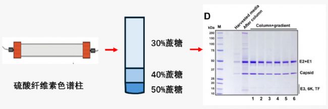 硫酸纖維素色譜(Column)將病毒濃度提高100倍,然后在不連續(xù)的蔗糖梯度中進行超速離心(gradient)去除雜質,再通過考馬斯染色檢測病毒