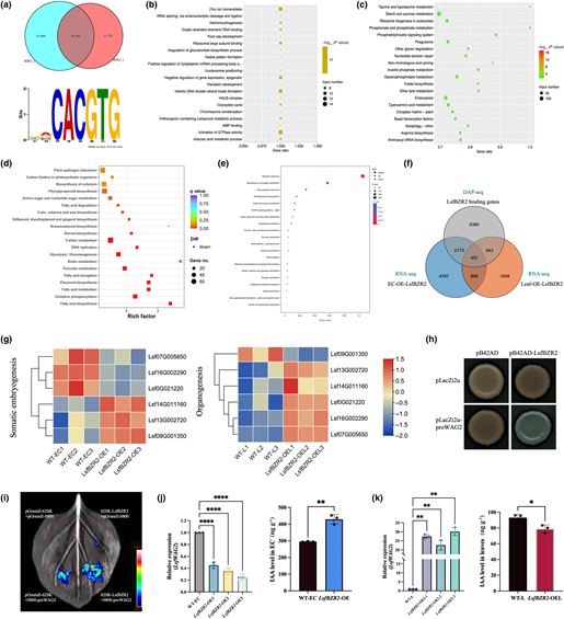 為了鑒定LsfBZR2調(diào)控的下游基因,作者采用DNA親和純化測序(DAP-seq)技術(shù)來識別該轉(zhuǎn)錄因子結(jié)合的基因組DNA元件。結(jié)果顯示LsfBZR2在36,582個基因組位點(diǎn)高度富集,涵蓋8,454個基因。其中12.2%位于啟動子區(qū)域,核心結(jié)合基序?yàn)?lsquo;CACGTG’。GO富集結(jié)果表明,與LsfBZR2蛋白結(jié)合位點(diǎn)相關(guān)的基因主要富集在鋅離子穩(wěn)態(tài)維持、分生組織發(fā)育、表觀遺傳學(xué)、減數(shù)分裂、乙醛酸循環(huán)和脫落酸代謝途徑。與RNA-seq數(shù)據(jù)聯(lián)合分析篩選出457個受LsfBZR2調(diào)控的差異基因,其中生長素外排載體基因LsfWAG2(Lsf07G005650)被確認(rèn)為直接靶基因。qRT-PCR與LC-MS/MS結(jié)果顯示,在SE途徑中,LsfBZR2過表達(dá)抑制LsfWAG2表達(dá),導(dǎo)致IAA積累,促進(jìn)愈傷增殖;在器官發(fā)生途徑中,LsfBZR2激活LsfWAG2表達(dá),加速生長素外排使IAA水平降低,從而促進(jìn)芽原基形成。酵母單雜交(Y1H)與雙熒光素酶報告實(shí)驗(yàn)(DLR)證實(shí),LsfBZR2直接結(jié)合啟動子區(qū)并調(diào)控其轉(zhuǎn)錄活性。