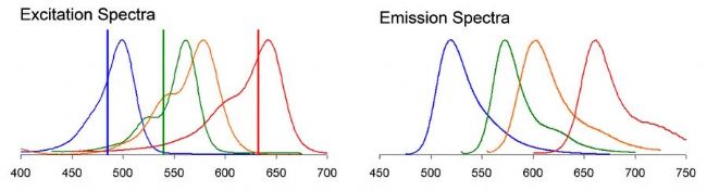 盡管光譜解混工具非常有用,但它們在樣本中解析熒光探針的能力有兩個主要限制。第一個限制是光譜解混受到系統(tǒng)中探測器數(shù)量的限制。換句話說,您無法解混超過系統(tǒng)能夠檢測的顏色。第二個主要限制是光譜解混算法無法區(qū)分相同顏色的熒光團(tuán),即那些具有相似發(fā)射光譜的熒光團(tuán)。
