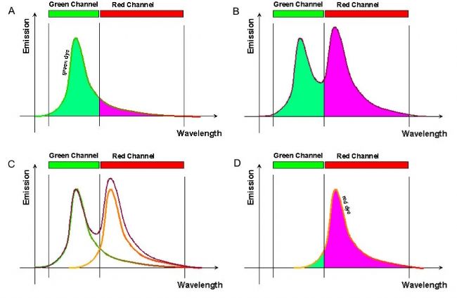 為了說明串色如何影響實驗結(jié)果,圖 2(A)顯示了僅兩個熒光染料的典型激發(fā)曲線,一個綠色和一個紅色。如圖 B 所示,這兩種染料的相應(yīng)發(fā)射曲線重疊。如果樣品中兩種染料的發(fā)射水平不可比,重疊的相對比例可能會更顯著(C)。當(dāng)發(fā)射的光通過檢測器(在這個假設(shè)的情況下通過帶通濾光片)時,兩個熒光染料的信號都在紅色通道中被檢測到(D)。