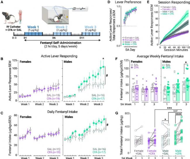首次明確炎癥疼痛僅增強雄性而非雌性大鼠的芬太尼使用,并發(fā)現(xiàn)其由VTA多巴胺神經(jīng)元活動增強驅(qū)動。