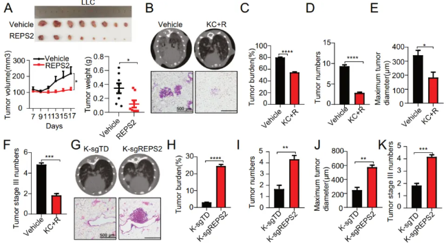 圖4 REPS2在體內(nèi)肺癌小鼠模型中是一種有效的腫瘤抑制因子。A. REPS2過表達對LLC異種移植物腫瘤的影響。腫瘤體積和腫瘤重量統(tǒng)計如下。B.REPS2過表達對轉(zhuǎn)基因小鼠原位肺腫瘤形成的影響。相應的HE分析圖像如下所示。C-F.腫瘤負荷、腫瘤數(shù)量、最大腫瘤大小和腫瘤III期數(shù)量的統(tǒng)計數(shù)據(jù)。G.敲除REPS2對Lsl-KrasG12D小鼠腫瘤形成的影響。相應的HE分析圖像如下所示。H-K腫瘤負荷、腫瘤數(shù)量、最大腫瘤大小和腫瘤III期數(shù)量的統(tǒng)計數(shù)據(jù)。