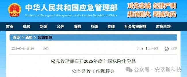 2月14日,全國危險化學(xué)品安全監(jiān)管工作視頻會在京召開,會議深入學(xué)習(xí)貫徹習(xí)近平總書記關(guān)于安全生產(chǎn)重要指示批示精神,認真落實國務(wù)院安委會全體會議、全國應(yīng)急管理工作會議部署,總結(jié)2024年工作,分析問題、研判形勢,安排部署2025年度重點工作。