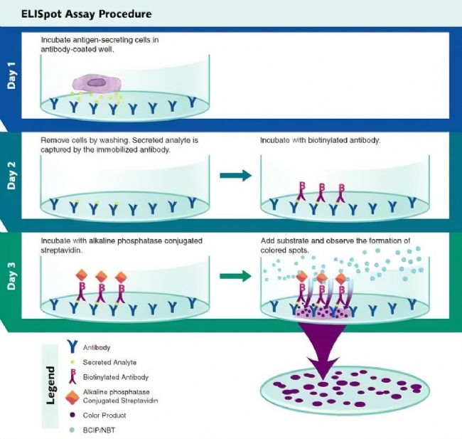 ELISpot 原理與 ELISA 相似但有創(chuàng)新。細(xì)胞受刺激后局部產(chǎn)生細(xì)胞因子,被預(yù)包被在 PVDF 孔板等固相載體上的特異單克隆捕獲抗體捕獲。細(xì)胞分解后,捕獲的細(xì)胞因子與生物素標(biāo)記的二抗結(jié)合,再與堿性磷酸酶標(biāo)記的親和素結(jié)合。經(jīng) BCIP/NBT 底物孵育,PVDF 孔板出現(xiàn) “紫色” 斑點(diǎn),每個(gè)斑點(diǎn)對(duì)應(yīng)一個(gè)分泌該細(xì)胞因子的活性細(xì)胞,通過 ELISpot 分析系統(tǒng)可得出分泌特定細(xì)胞因子的細(xì)胞頻率。Elispot原理單細(xì)胞水平檢測(cè):通過捕獲抗體和顯色反應(yīng),可視化分泌特定蛋白的細(xì)胞。