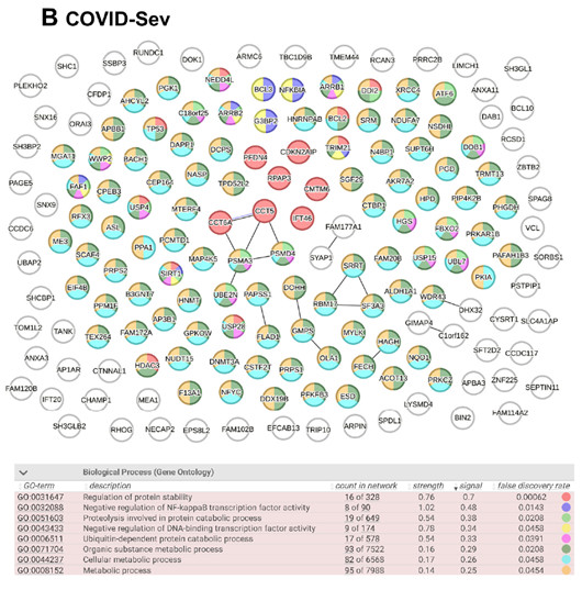 圖3. 新冠誘導(dǎo)IgG靶向蛋白的蛋白質(zhì)-蛋白質(zhì)相互作用網(wǎng)絡(luò)(PPIN)分析。使用COVID-Mod組(136個(gè)節(jié)點(diǎn))和COVID-Sev組(168個(gè)節(jié)點(diǎn))的IgG靶向蛋白完整列表(包含兩組共同靶向蛋白)進(jìn)行PPIN分析,數(shù)據(jù)通過STRING平臺(tái)(STRING Consortium, 2024)分析。對(duì)所有鑒定蛋白分別進(jìn)行了結(jié)構(gòu)同源性和共表達(dá)評(píng)估。網(wǎng)絡(luò)圖中節(jié)點(diǎn)代表蛋白質(zhì)靶點(diǎn),連線代表基于結(jié)構(gòu)同源性(黑色)或共表達(dá)(紫色)的蛋白質(zhì)-蛋白質(zhì)關(guān)聯(lián)。通過基因本體(GO)生物過程分析識(shí)別顯著富集通路(錯(cuò)誤發(fā)現(xiàn)率FDR < 0.05)。(A) COVID-Mod組未發(fā)現(xiàn)顯著富集的生物過程。(B) COVID-Sev組中節(jié)點(diǎn)按其涉及的最相關(guān)生物過程進(jìn)行顏色編碼,具體對(duì)應(yīng)關(guān)系見附表。
