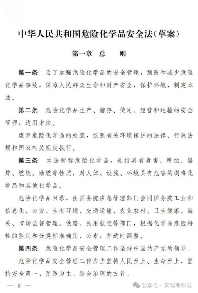 這部法律草案的核心是為化學(xué)品建立全生命周期的安全管理體系。主要規(guī)定了: