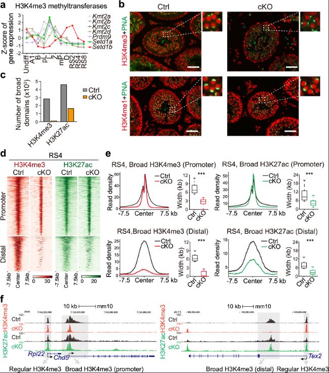 此外,Setd1b基因敲除小鼠表現(xiàn)出精子形態(tài)異常、精子數量減少和運動能力下降,最終導致不育。表明SETD1B和broad H3K4me3的破壞導致男性不育和精子發(fā)生異常。