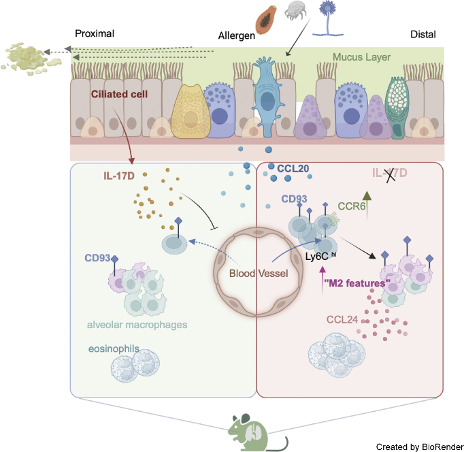 Yuan L, Huang J, Chen J, Xie T, Wang G, Xie B, Qin L, Chen Y, Zhong X, Zhao Z, Peng Z, Wang X, Xu M, Ge J, Wang X, Dong C. Ciliated cell-derived IL-17D restrains allergic asthma through controlling monocyte recruitment. J Exp Med. 2025 Oct 6;222(10) doi: 10.1084/jem.20242328.