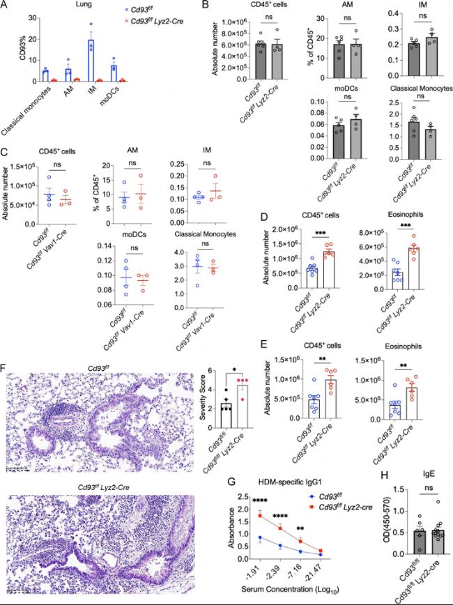 在HDM模型中,Cd93條件性敲除小鼠(Cd93f/f×Lyz2-Cre)表現(xiàn)出更嚴(yán)重的過敏反應(yīng),包括肺部和BALF中免疫細(xì)胞浸潤增加,以及血清中HDM特異性IgG1水平升高。這表明CD93在單核細(xì)胞和巨噬細(xì)胞中對過敏性哮喘具有保護(hù)作用。