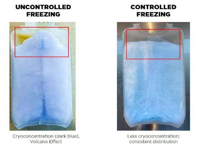 Figure 1: Visualization of the volcano effect in bottles occurring in uncontrolled freezing, compared to consistent distribution in controlled freezing. 圖 1:不受控冷凍時(shí)瓶子中火山效應(yīng)的可視化,與受控冷凍時(shí)的一致分布進(jìn)行比較。
