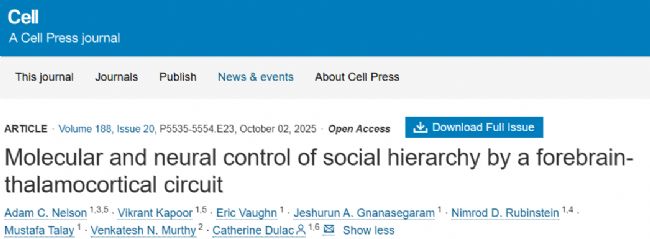 2025年8月11日,美國學者在Cell期刊上發(fā)表了題名為“Molecular and neural control of social hierarchy by a forebrain-thalamocortical circuit”的研究論文,本研究揭示了前腦-丘腦-皮層神經(jīng)環(huán)路調(diào)控社會等級的可塑性機制。