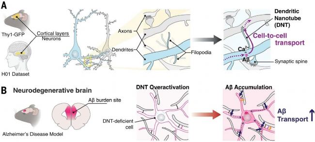 通過高分辨率顯微成像技術,研究團隊在視覺皮層觀察到樹突納米管在錐體神經(jīng)元間形成動態(tài)連接,其形態(tài)和內(nèi)部結構均不同于經(jīng)典突觸。功能實驗證實這些納米管可作為鈣信號和病理性蛋白(如阿爾茨海默病相關的β-淀粉樣蛋白)在細胞間直接傳輸?shù)耐ǖ。在阿爾茨海默病模型小鼠中?span style="color:rgb(134, 52, 193)">納米管網(wǎng)絡在淀粉樣斑塊形成前就已發(fā)生顯著改變,計算模型進一步揭示其過度活化可能加速毒性蛋白的神經(jīng)元內(nèi)累積。