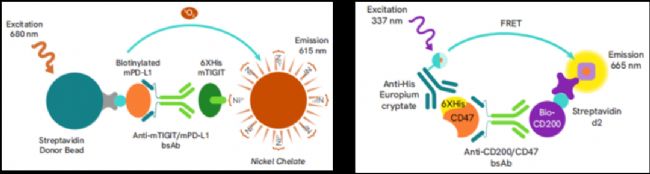 不同結構類型的BsAb都可以使用HTRF/Alpha技術來表征結合活性,以IgG樣BsAb為例,其結合活性可通過帶有不同標簽的抗原(如生物素化抗原與His標簽化抗原)及相應標簽抗體的toolbox試劑進行評價。
