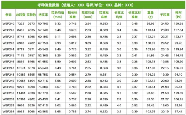 采用線單次測量,同步獲取總粒數(shù)、實粒數(shù)、結(jié)實率、粒長、粒寬、粒面積、粒周長及千粒重等多個關鍵參數(shù),滿足全方位考種需求。